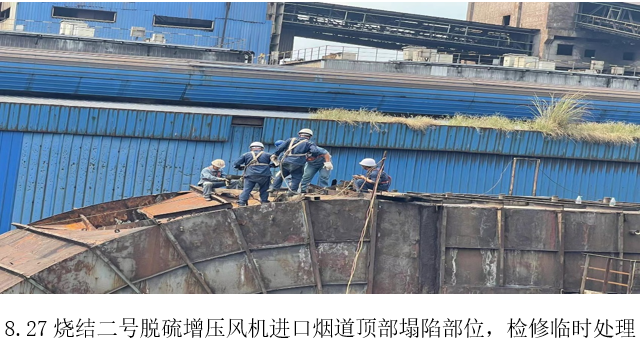 8月27日,檢修員在巡檢時(shí)發(fā)現并上報了燒結二號脫硫增壓風(fēng)機進(jìn)口煙道頂部約27㎥鋼板出現塌陷,威遠藍鼎生產(chǎn)部高度重視,立即將風(fēng)險隱患上報燒結廠(chǎng)部領(lǐng)導,協(xié)商時(shí)間處理。當天廠(chǎng)部協(xié)商停機4小時(shí)對脫落部位進(jìn)行臨時(shí)加固處理。8月28日,廠(chǎng)部利用高溫限電停機11小時(shí),對二號燒結進(jìn)口煙道頂部脫落位置進(jìn)行全面檢修。